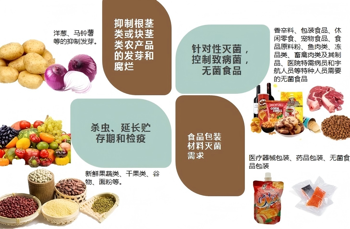 水果蔬菜类:抑制发芽(如土豆、大蒜)、延缓成熟、杀虫杀菌。
