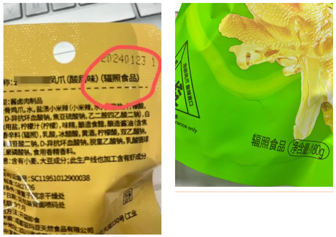 对于含有辐照配料的加工食品:例如一包方便面,如果其中的调味料包(如蔬菜包、粉包)经过了辐照处理,那么在产品背面的配料表中,该辐照配料旁边会明确标注“(辐照)”或“辐照食品”字样。例如:“脱水香葱(辐照)”、“调味粉包(辐照)”。