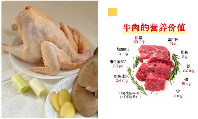 鸡肉:性温,温中益气,适合炖汤,如香菇鸡汤。