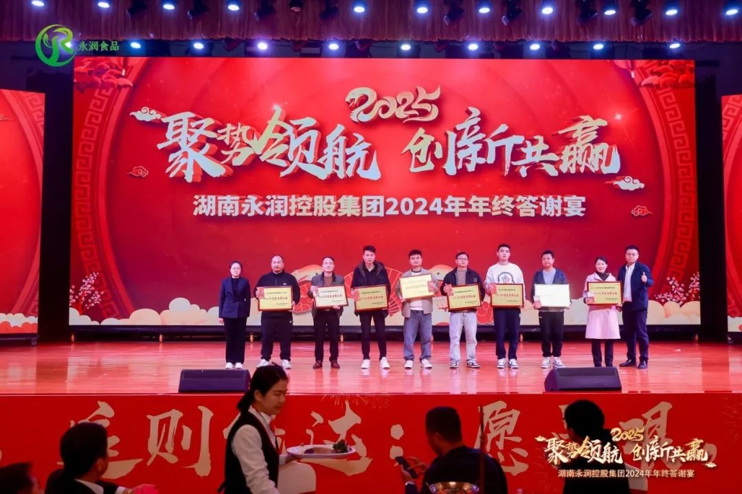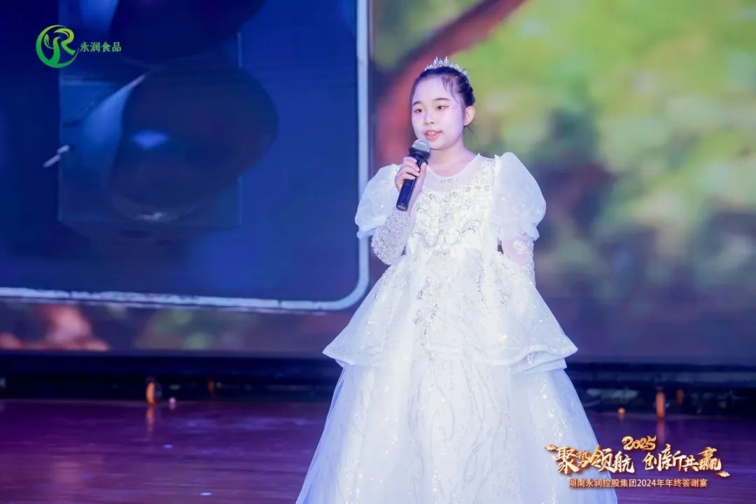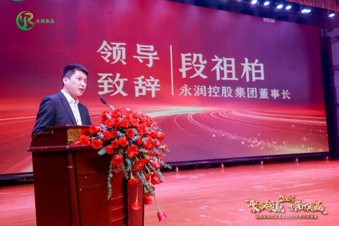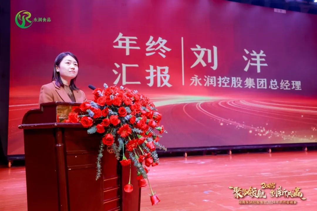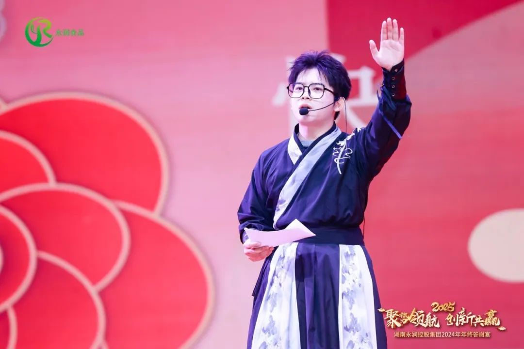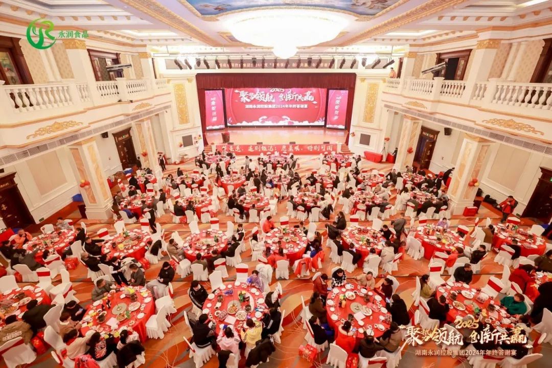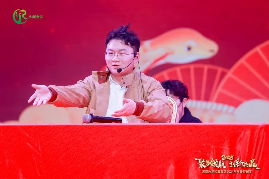 年会在欢快声中拉开帷幕。首先集团董事长段祖柏在宴会上向到场的所有嘉宾及人员表示感谢,同时对2024年做了回顾以及对2025年提出了新的希望和要求。其次集团总经理刘洋就过去一年集团的工作业绩进行了年终汇报,她分享2024年的关键词是“稳中求进,实属不易”。在业绩上实现了稳步小幅增长,成功新增了教育系统板块。在公司内部管理方面,进行了从精细化管理到合规化数字化管理的改革。对于员工不再是简单的管理者与被管理者的关系,而是共同成长的伙伴。对于供应商也不再是简单的采买关系,而是协同合作的伙伴。2024年公司与长沙县政府签约了永润数字农业融合发展基地。这一项目的落地,标志着我们在产业融合和创新发展方面迈出了坚实的一步。它不仅将为公司带来更广阔的发展空间,也将推动整个食品行业的数字化转型和产业升级。